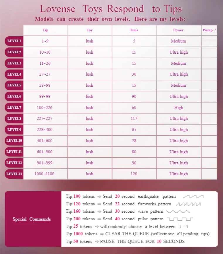 Like Me -- 100 Pm -- 10 Fly Kiss -- 5 Spank ass -- 33 Suck Fingers -- 55 Show ass -- 66 Flash Tits -- 88 Show Feet -- 44 Topless 5 min -- 155 Naked 10 min -- 333 Dance -- 222 Snap -- 450 Play with pussy -- 300 Play with dildo -- 500 You my hero -- 1111 My Dream Tip -- 5555